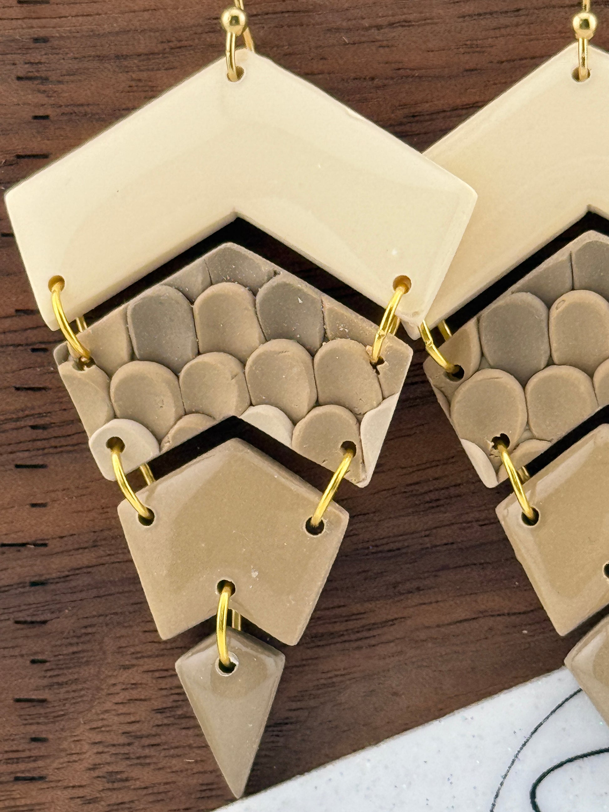 Handcrafted "dragon scale" earrings featuring an inverted chevron pattern meticulously layered in soft ivory, brown, and tan hues. Constructed from lightweight polymer clay with hypoallergenic stainless steel findings, these sophisticated pieces measure nearly 3 inches in length. Each pair showcases the artisan's dedication to detail, with individually sculpted "scales" that capture an otherworldly elegance. Perfect for those who appreciate wearable art with mythical inspiration.