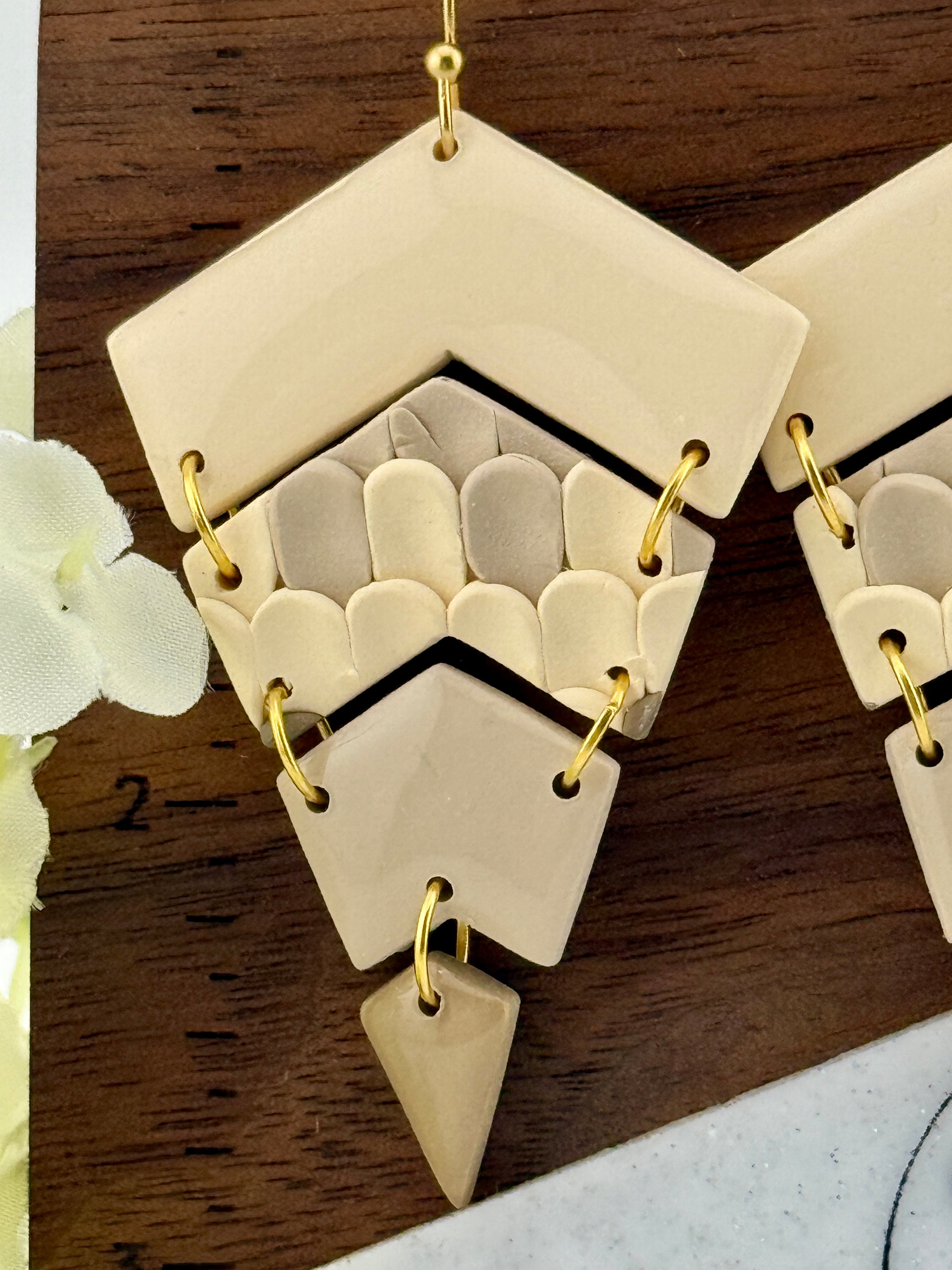 Handcrafted "dragon scale" earrings featuring an inverted chevron pattern meticulously layered in soft ivory, soft brown, and tan hues. Constructed from lightweight polymer clay with hypoallergenic stainless steel findings, these sophisticated pieces measure nearly 3 inches in length. Each pair showcases the artisan's dedication to detail, with individually sculpted "scales" that capture an otherworldly elegance. Perfect for those who appreciate wearable art with mythical inspiration.