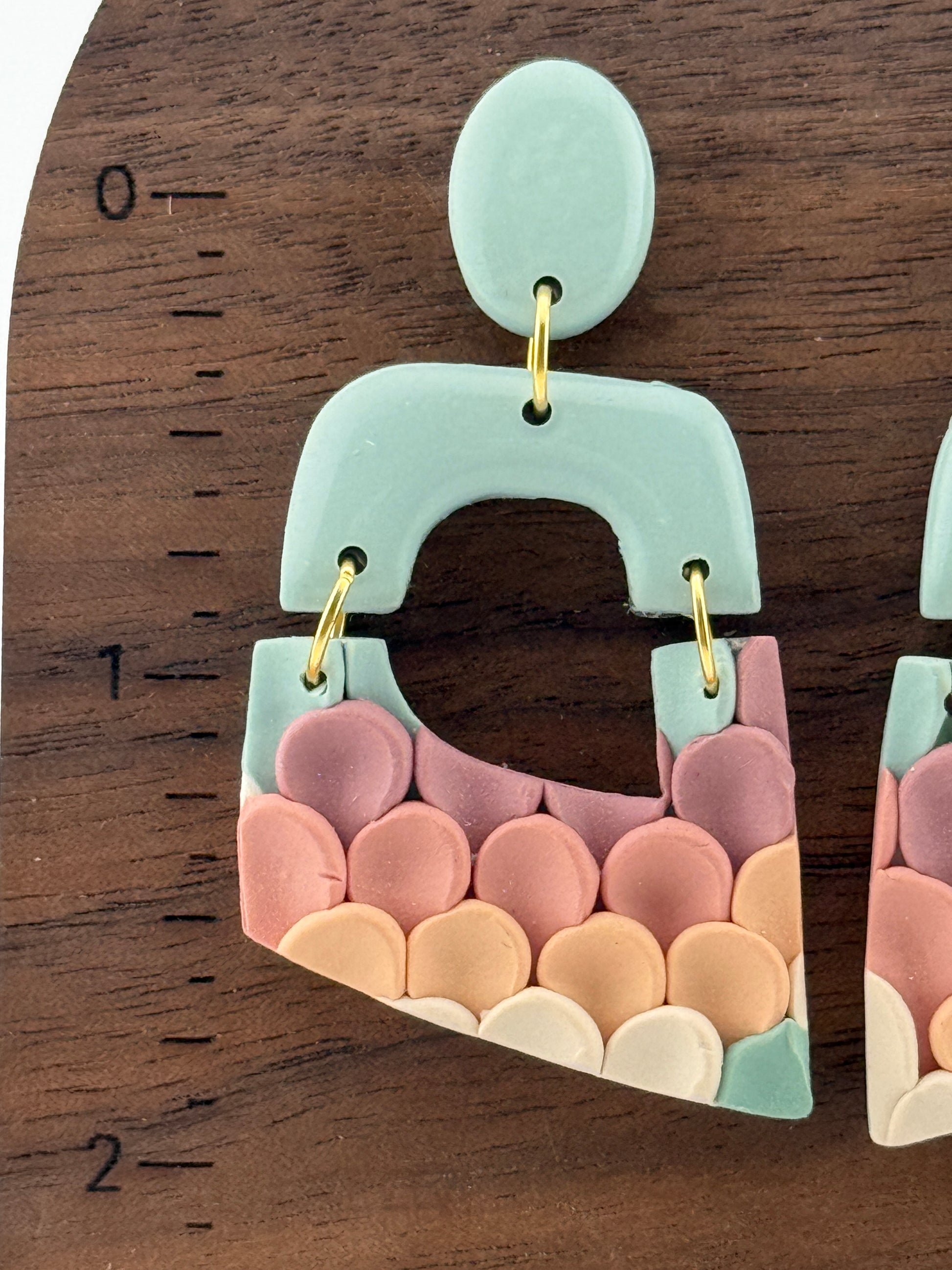 These exquisite hand-made "dragon scale" earrings represent a singular expression of refined artistry. Meticulously crafted in a delicate palette of minty green, rose and peach the unique mirrored design showcases intricately layered "scales" that evoke mythical elegance. Gold hardware accents provide a subtle luminous touch, while the lightweight polymer clay construction ensures graceful proportions at approximately 2 inches. Finished with hypoallergenic stainless steel posts, each pair is a bespoke creation for the discerning collector who values handcrafted distinction.