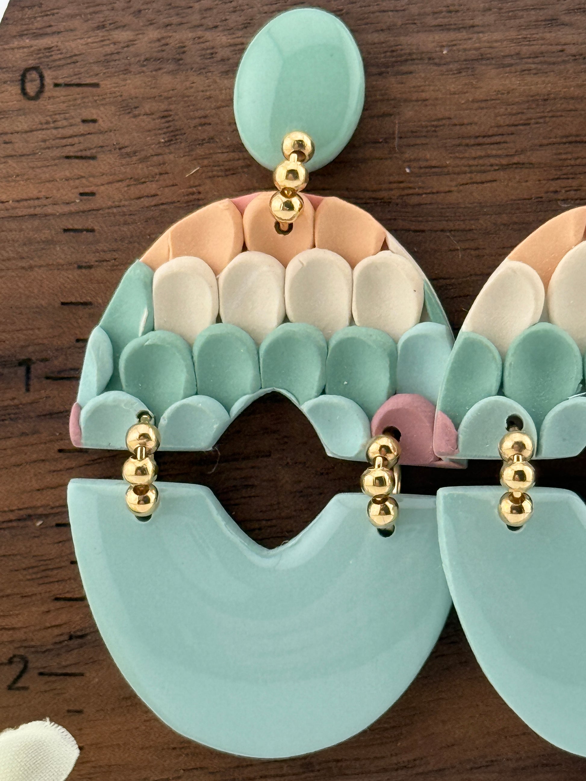 These exquisite hand-made "dragon scale" earrings represent a singular expression of refined artistry. Meticulously crafted in a delicate palette of minty green, ivory, and soft peach, the two-part oval design showcases intricately layered "scales" that evoke mythical elegance. Gold hardware accents provide a subtle luminous touch, while the lightweight polymer clay construction ensures graceful proportions at approximately 2.5 inches. Finished with hypoallergenic stainless steel posts, each pair is a bespoke creation for the discerning collector who values handcrafted distinction.