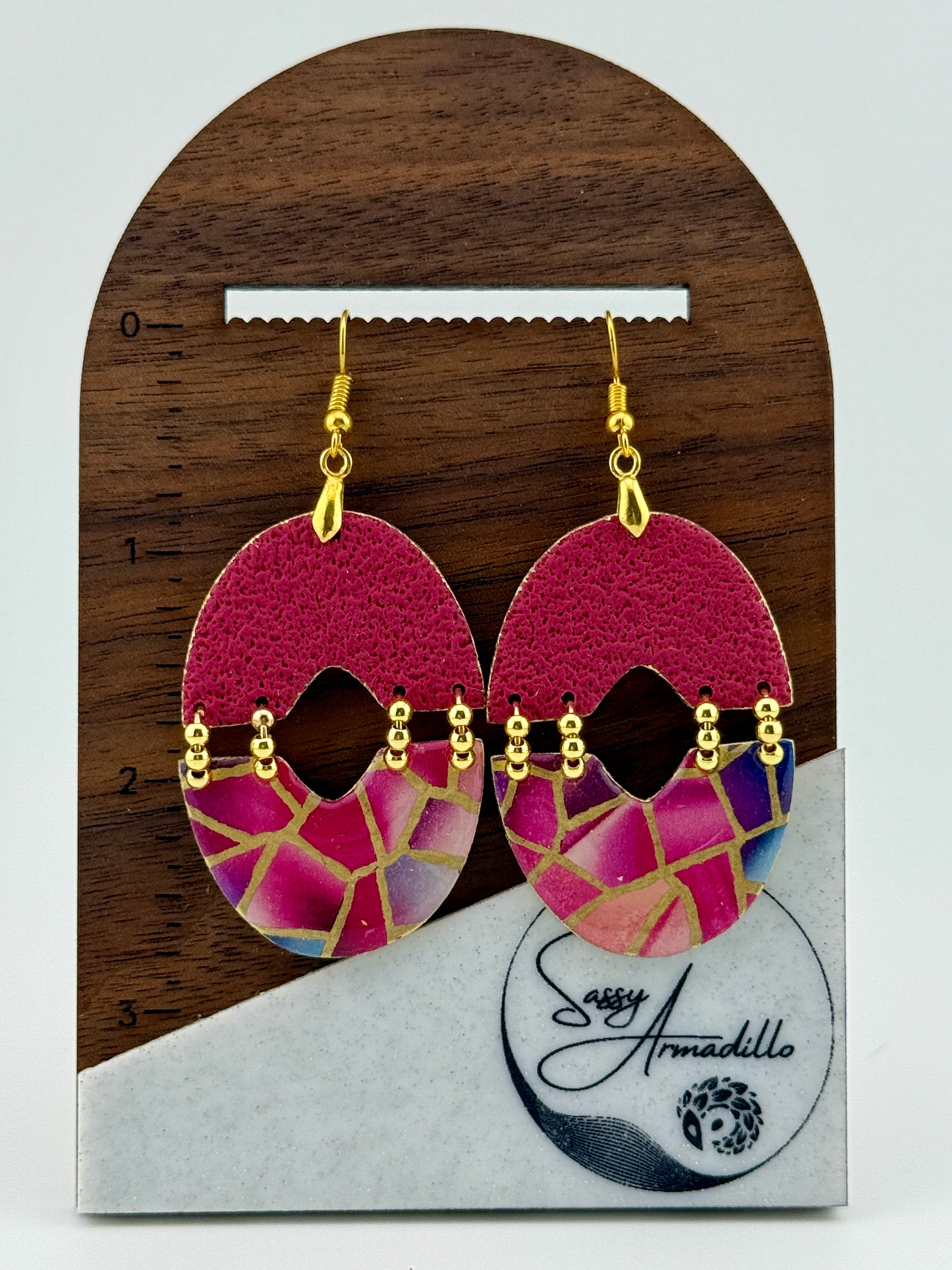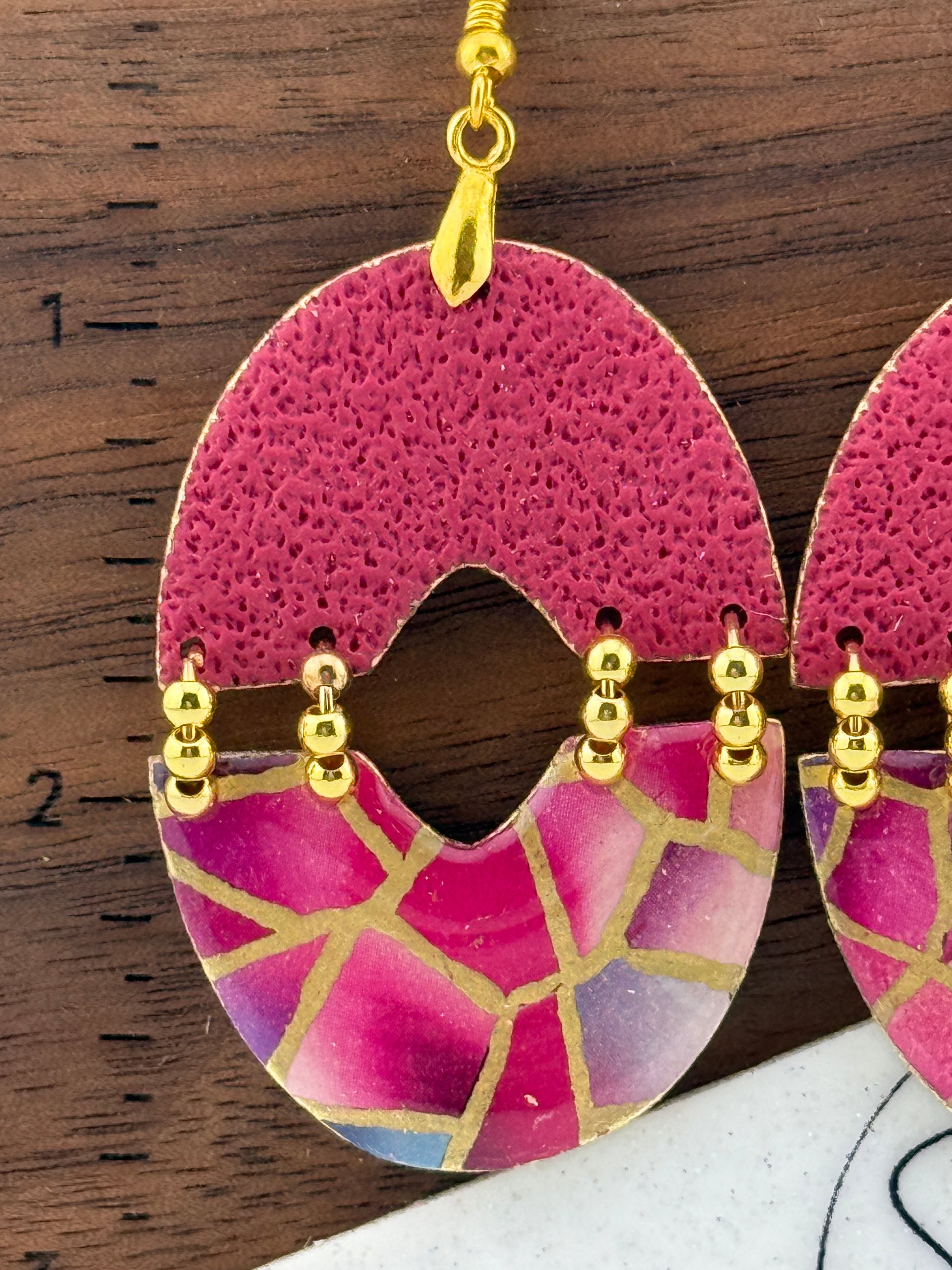 Meet your new favorite statement makers! These one-of-a-kind handmade earrings blend artistry with comfort. Crafted from lightweight polymer clay, they feature a charming two-part oval design that's as unique as you are. The bottom showcases a gorgeous stained glass effect in shades of vibrant rose, while the top boasts a textured dark rose finish. Bright gold hardware adds a touch of glamour, and hypoallergenic stainless steel hooks ensure all-day wearability. At 2.75 inches long, they're bold, beautiful, and impossible to ignore!