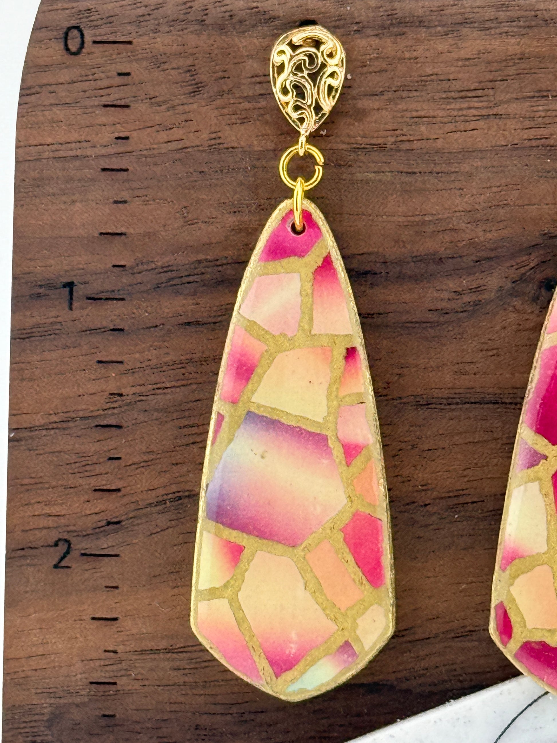 Handcrafted polymer clay earrings that capture the magic of stained glass in miniature form. Each pair is a one-of-a-kind creation featuring pastel rose, and lemon hues with shimmering gold accents that catch the light beautifully. Lightweight enough for all-day wear, these artistic studs sit on lacy hypoallergenic stainless steel posts in matching gold tone. Perfect for adding a pop of color and personality to any outfit! 2.5" long