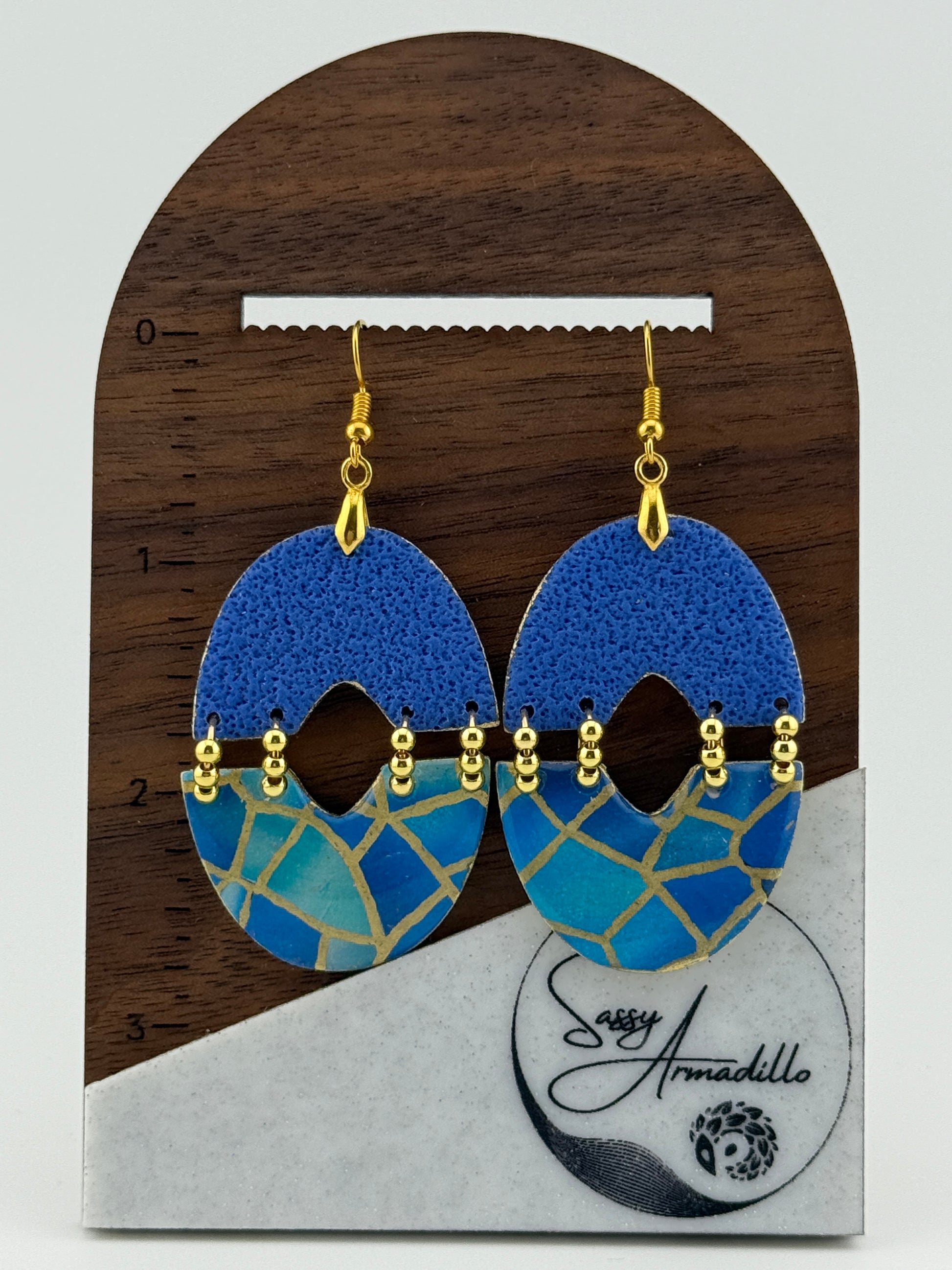 Meet your new favorite statement makers! These one-of-a-kind handmade earrings blend artistry with comfort. Crafted from lightweight polymer clay, they feature a charming two-part oval design that's as unique as you are. The bottom showcases a gorgeous stained glass effect of turquoise and blue, while the top boasts a textured royal blue finish. Bright gold hardware adds a touch of glamour, and hypoallergenic stainless steel hooks ensure all-day wearability. At 2.75 inches long, they're bold, beautiful, and impossible to ignore!