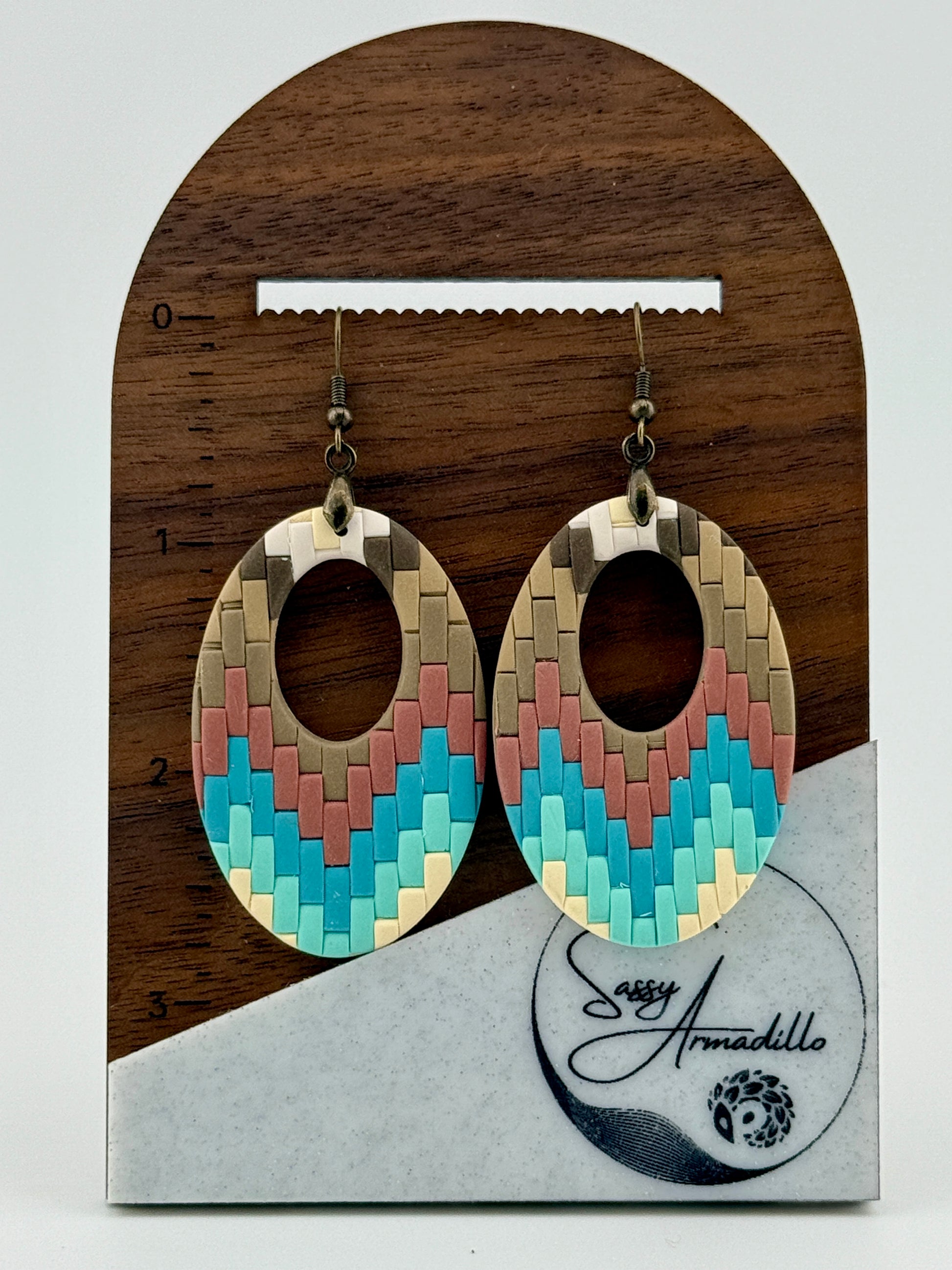 These eye-catching Southwest Bargello earrings feature a striking cutout oval design in rich brown, turquoise, ivory, and terracotta hues that'll have everyone asking where you found them. Handcrafted with care, each pair is totally one-of-a-kind. Suspended from bronze-finish stainless steel hooks, they measure 2.75" long for that perfect statement-making length. Wear your southwestern spirit with style!
