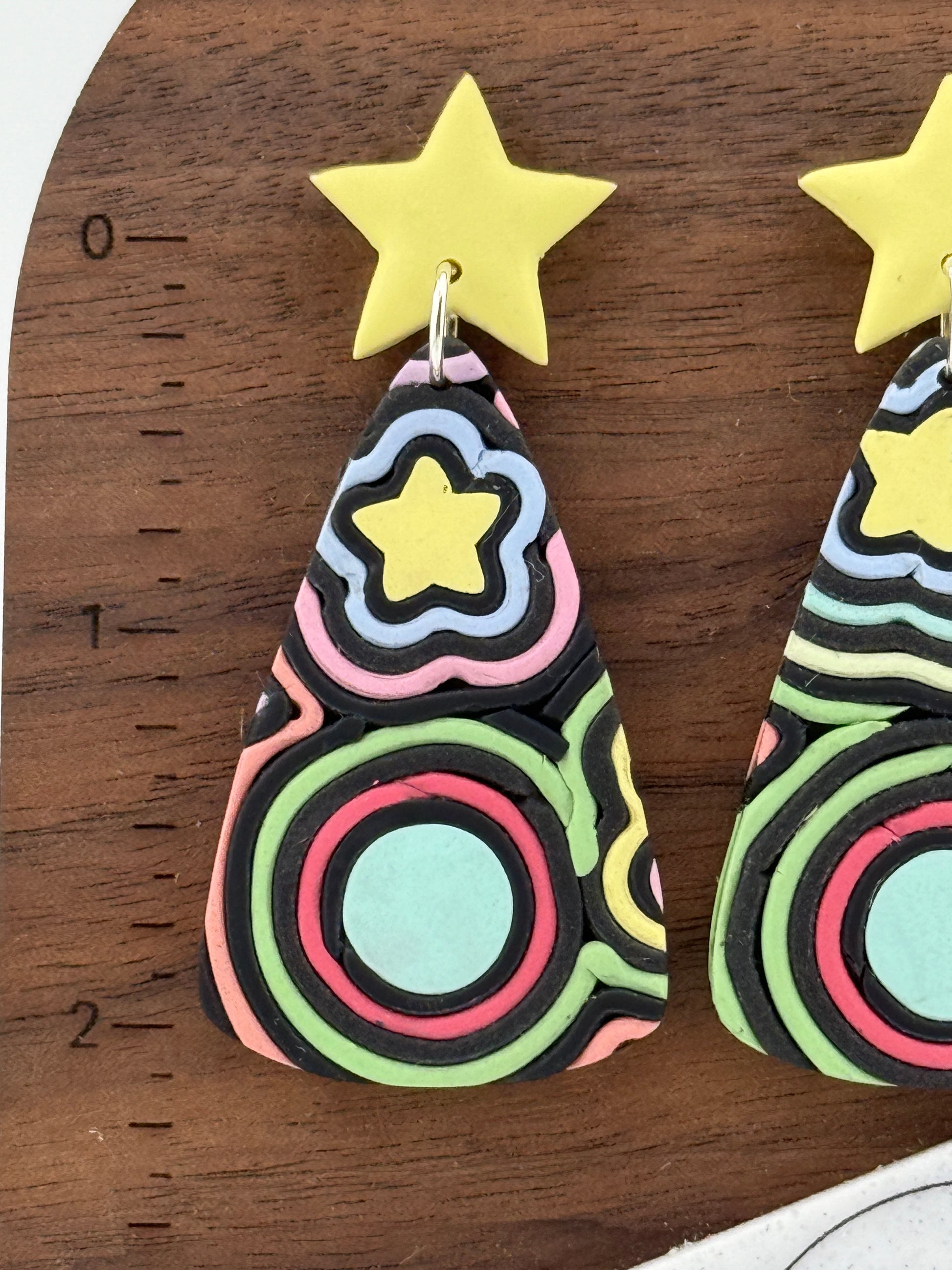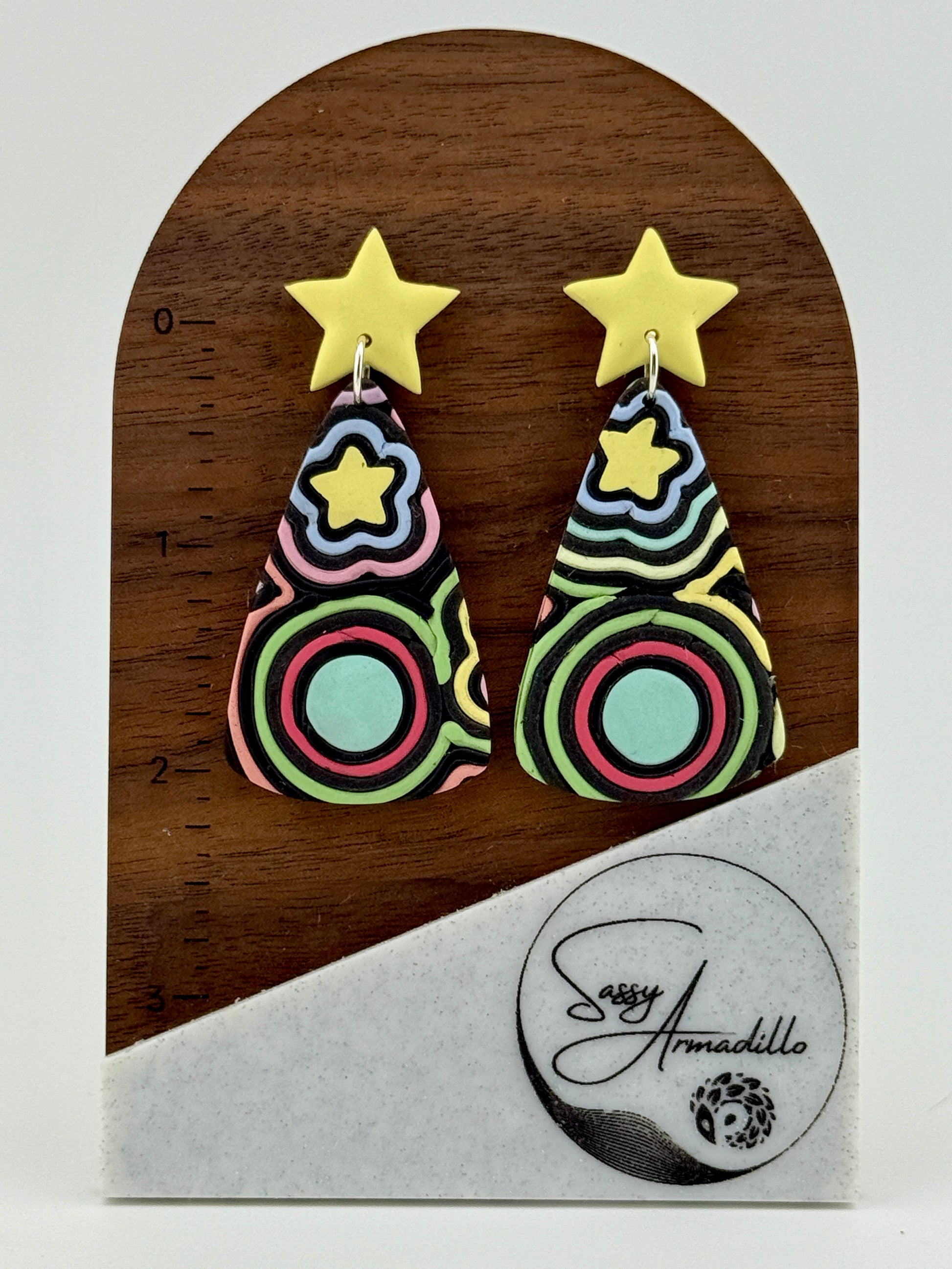 Inspired by a vintage Dooney & Bourke handbag, these one-of-a-kind earrings celebrate retro flair with bold black backgrounds and vibrant striped patterns. Handcrafted from polymer clay and cut from the same handmade slab, each pair features "sister" earrings that are beautifully unique—never identical twins. At 2.25" long, they make a statement without the weight. Hypoallergenic stainless steel posts keep them comfortable for all-day wear. Pure nostalgia with a playful twist!