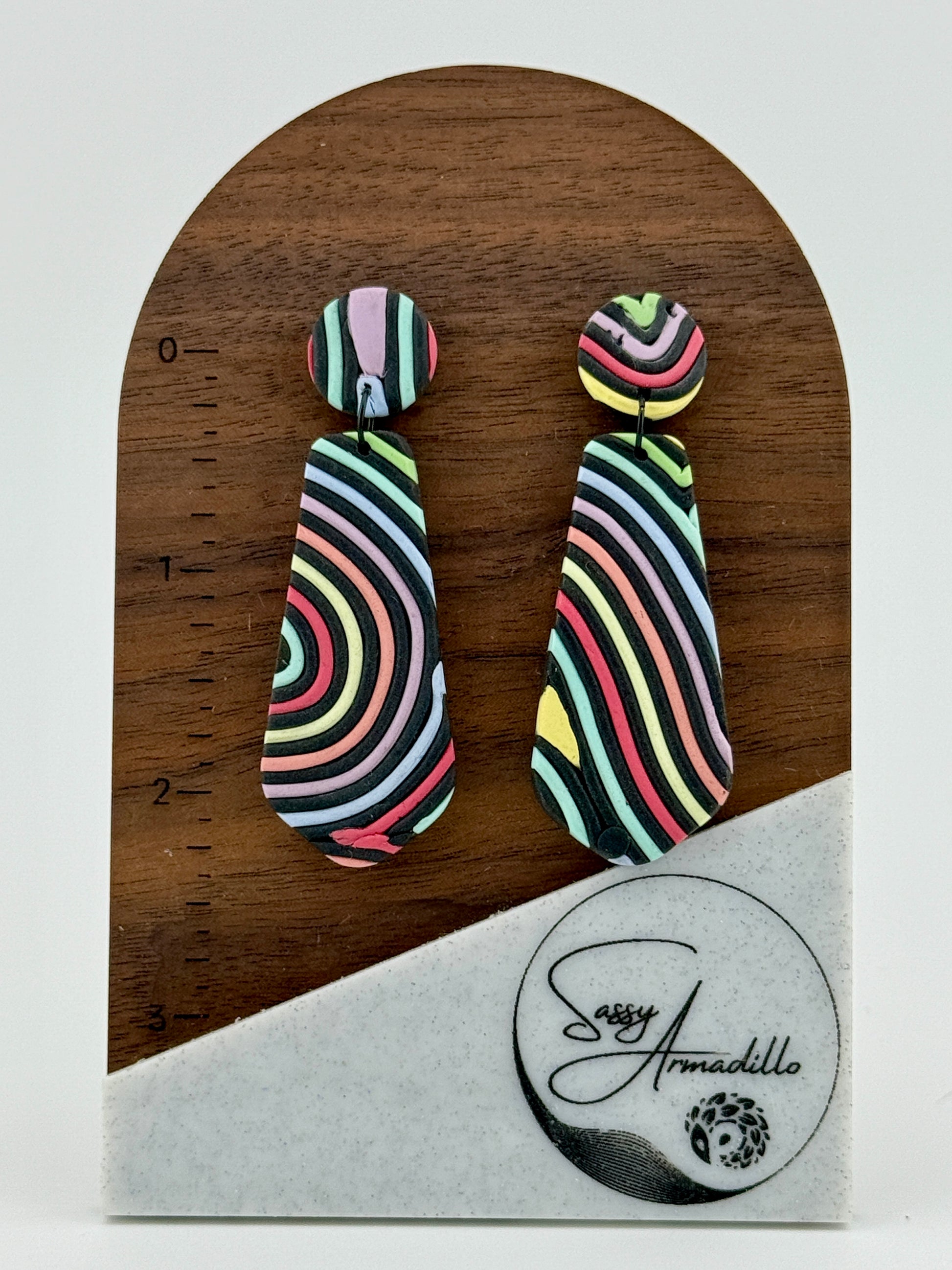Inspired by a vintage Dooney & Bourke handbag, these one-of-a-kind earrings celebrate retro flair with bold black backgrounds and vibrant striped patterns. Handcrafted from polymer clay and cut from the same handmade slab, each pair features "sister" earrings that are beautifully unique—never identical twins. At 2.5" long, they make a statement without the weight. Hypoallergenic stainless steel posts keep them comfortable for all-day wear. Pure nostalgia with a playful twist!