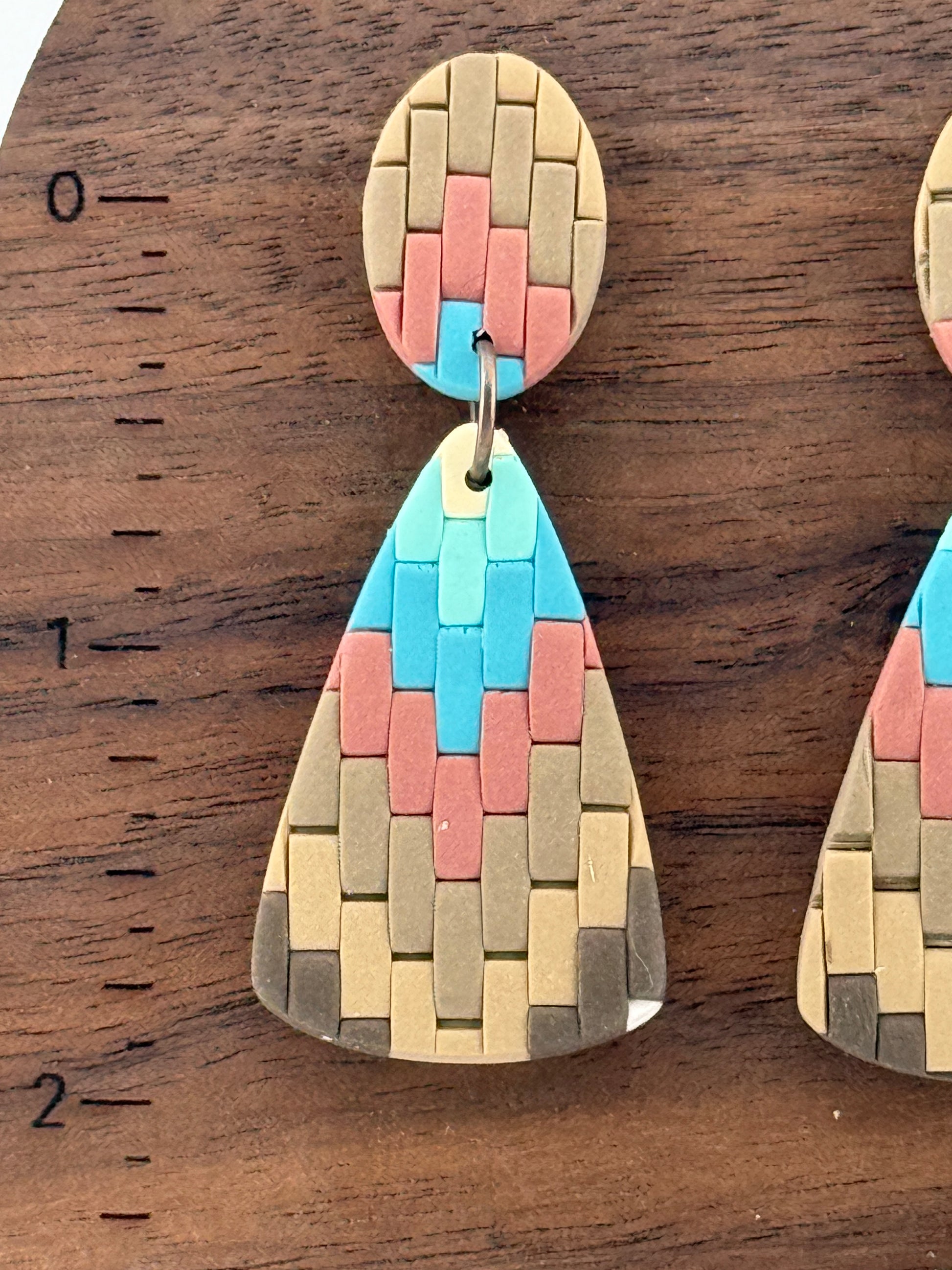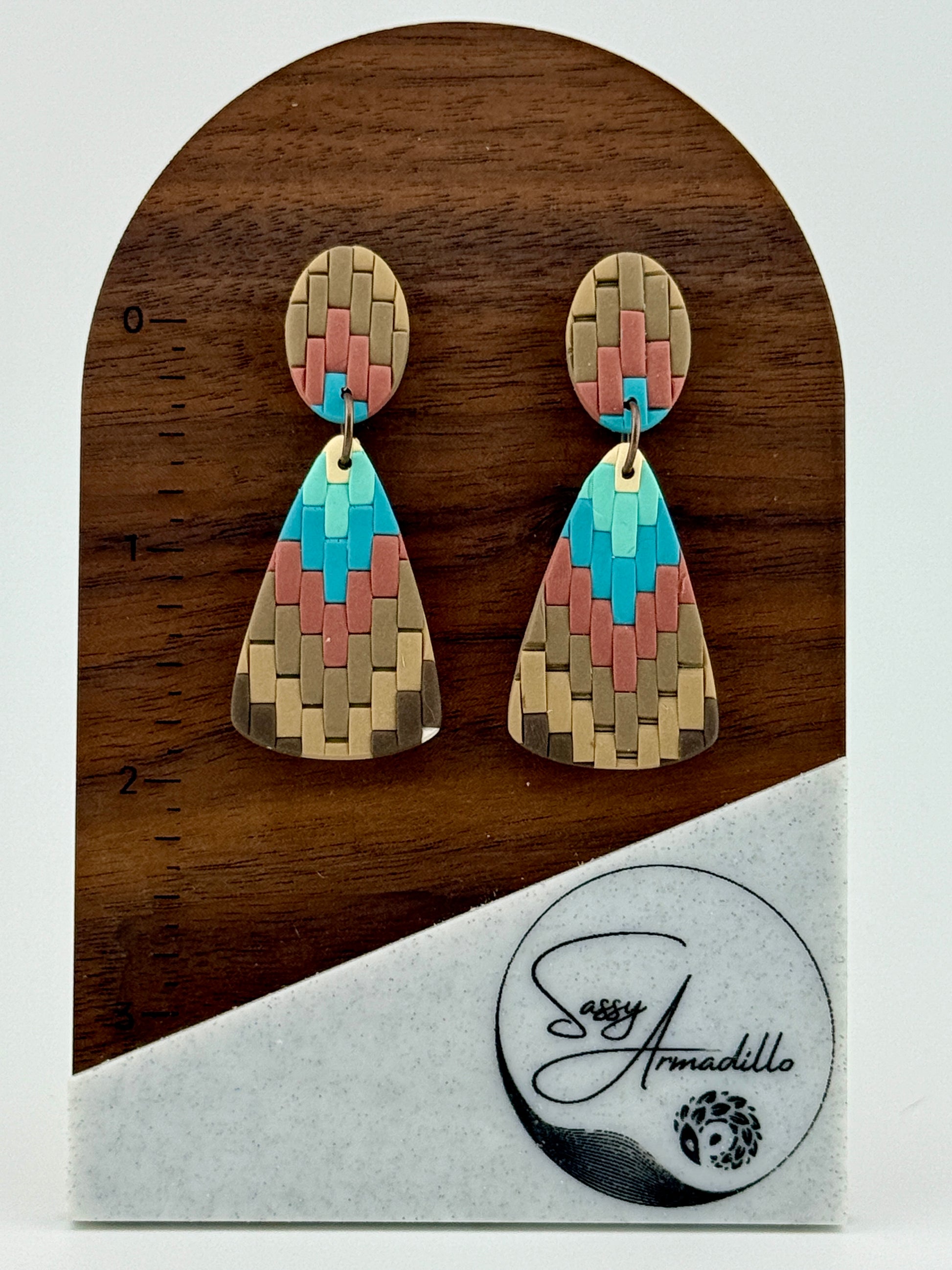 These eye-catching Southwest Bargello earrings feature a unique design in rich brown, turquoise, ivory, and terracotta hues that'll have everyone asking where you found them. Handcrafted with care, each pair is totally one-of-a-kind. Suspended stainless steel posts, they measure 2" long for that perfect statement-making length. Wear your southwestern spirit with style!